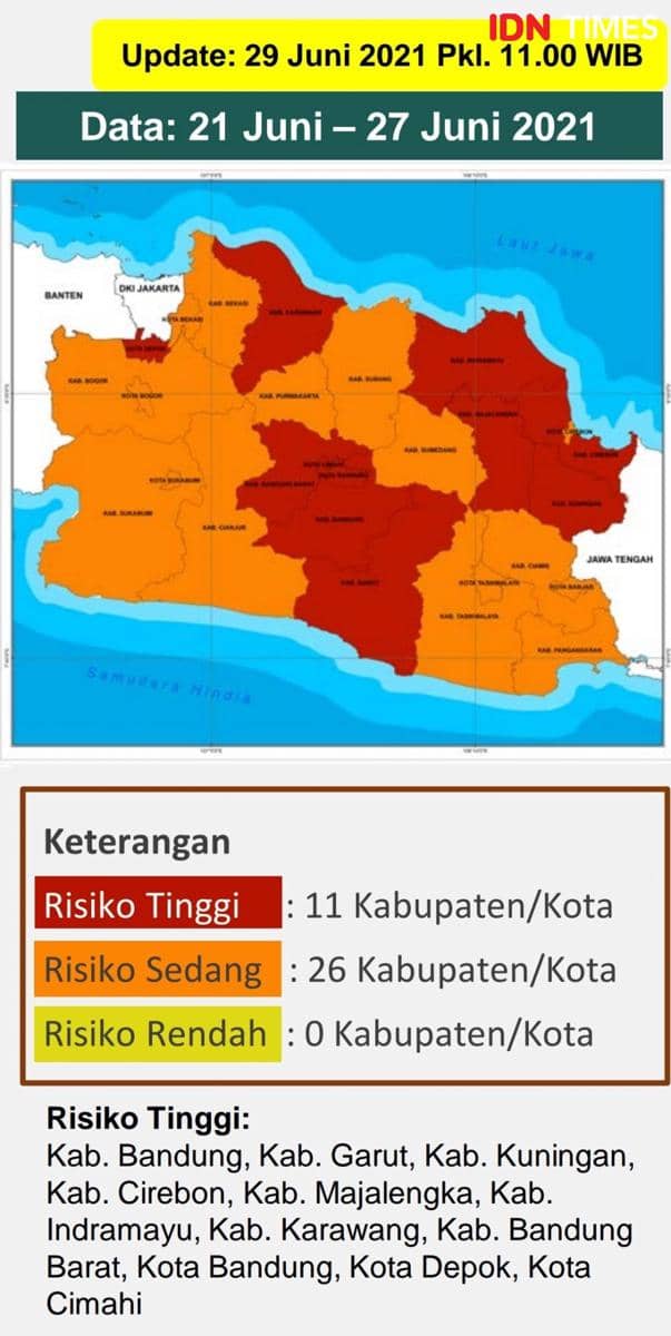 Berdasarkan data update relaese Sub Divisi Data dan Kajian Epidemiologi, Divisi Penanganan Kesehatan, Satuan Tugas (Satgas) Penanganan COVID-19 pada Selasa (29/6/2021) 11 wilayah yang masuk zona merah yaitu Kota Bandung, Depok, dan Cimahi.